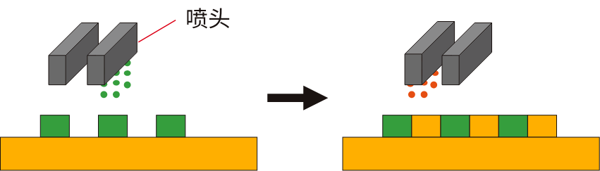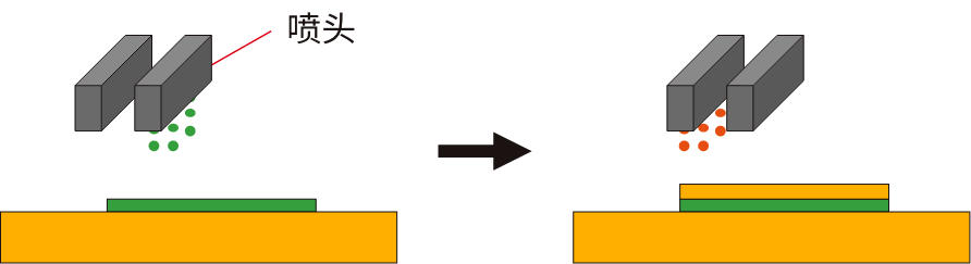 使用多個(gè)噴頭的裝置,可同時(shí)進(jìn)行多種油墨的涂布。