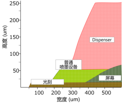 兼具微細(xì)涂布與高深寬比涂布,可以發(fā)揮“大范圍印刷”,“削減工藝”等性能優(yōu)勢(shì),實(shí)現(xiàn)其它Dispenser方式下難以實(shí)現(xiàn)的工藝要求。