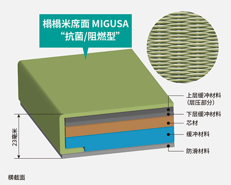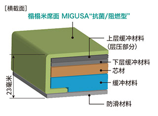 在榻榻米席面MIGUSA的樹脂材料(聚丙烯)上,賦予了抑制細菌增殖的抗菌成分和預防火災的防火性能,是一種抗菌、防火榻榻米。